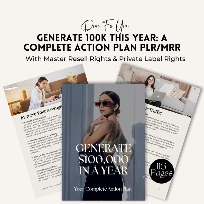 Generate $100K This Year Action Plan 🌻 MRR + PLR | Canva Editable eBook. Dreaming of hitting six figures this year? Whether you're starting from scratch or scaling what you’ve already built, the Generate $100K This Year Action Plan is your no-fluff, step-by-step roadmap to making it happen. This powerful 115-page guide is designed for entrepreneurs, digital product sellers, and faceless marketers who are serious about creating financial freedom and building real momentum in their business.